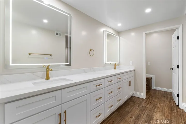 Set against a lush hillside backdrop, this single-story residence offers privacy, scale, and resort-style living. A gated driveway and separate gated RV parking are complemented by stacked-stone planters, brick-accented walkways, and curated landscaping with subtle lighting, creating a composed and welcoming arrival. The front porch introduces brick flooring and architectural lighting, opening through elegant iron-accented double doors into a thoughtfully designed interior. The foyer features herringbone tile, exposed beam detailing, and recessed lighting, with clean sightlines into the home’s primary living spaces. The living room is anchored by a bay window with plantation shutters overlooking the front yard, while the formal dining room is defined by French doors, a coffered ceiling, and a statement chandelier. The kitchen has been reimagined with white shaker cabinetry, quartz countertops, custom tile backsplash, brushed brass hardware, and designer pendant lighting. Stainless steel appliances include a gas cooktop with vent hood, a built-in oven and microwave, and a full-size refrigerator, with a peninsula providing casual seating. The family room offers vaulted beam ceilings, recessed lighting, and a stacked-stone fireplace with raised hearth. French doors open to the backyard, creating a seamless indoor-outdoor connection, with plantation shutters adding architectural continuity and privacy. The primary suite features plantation-shuttered windows, a slider with direct access to the rear patio, a walk-in closet, and a sliding barn door leading to the ensuite bath. The primary bathroom is finished with a long dual-sink quartz vanity, brushed brass fixtures, illuminated mirrors, and a walk-in shower clad in large-format tile with a hex-tile niche detail. Three additional bedrooms offer generous closets and shuttered windows, one with bamboo flooring. The hall bathroom mirrors the home’s finishes with a quartz vanity, modern fixtures, illuminated mirrors, and a tiled shower-tub surround. Outdoors, the backyard is designed as a private retreat with a pool and spa, expansive patios with stone inlays, a covered rear patio, built-in barbecue, and a central fire pit, all framed by mature palms and natural hillside greenery. The wide, fully gated driveway offers ample parking and access to the garage offering epoxy floors, a tankless water heater, and a Tesla charger. Additional upgrades: smooth finished interior drywall, owned solar and blown-in insulation.
