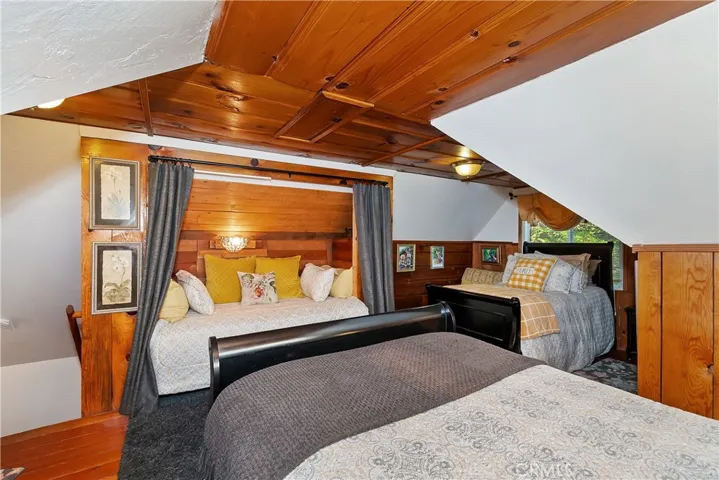 Vintage mountain charmer—Inside, original knotty pine paneling and wood floors create a warm, authentic mountain ambiance. Cozy one-bedroom, one-bath cottage . Plenty of large windows in the living room and dining area allow you to enjoy the inviting outside views. Galley kitchen with sitting area for meals .Upstairs is a large 1 bedroom space. Perfect as a mountain getaway or full-time retreat, this home offers a convenient location just minutes from downtown Crestline & beautiful Lake Gregory Regional Park, you’ll enjoy easy access to all the area has to offer. This vintage cabin sits on a generous gently sloping wooded lot. Whether you’re seeking a weekend escape or a quaint year-round residence, this cottage is the mountain retreat you’ve been looking for.