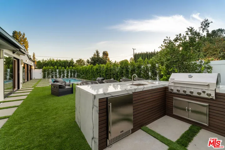 Welcome to this privately gated, single-story South of the Boulevard home that has been beautifully updated inside and out. Double doors invite you into a bright and airy open floor plan that features a spacious formal living and dining room with vaulted ceilings, inviting family room and state-of-the-art chef s kitchen equipped with top-of-the-line stainless steel appliances and a massive island with a breakfast counter. Dual oversized sliding glass doors extend your living space outside for true indoor-outdoor living. Surrounded by privacy hedges, the tranquil backyard oasis is highlighted by a sparkling pool/spa, outdoor kitchen with bbq and a built-in fire pit. There are three generously sized ensuite bedrooms, including a luxurious primary suite that offers a custom walk-in closet and spa-like bathroom boasting an oversized rainfall shower and double vanity. Additional amenities include a laundry room and two-car garage. This prime South of the Boulevard location is in the heart of Tarzana, within a top-rated school system and moments away from shops, restaurants and easy access to the 101 freeway. Available to lease fully furnished at $15,000/mo.