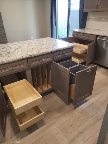 The beautiful kitchen is a chef’s dream, featuring granite countertops, high-grade appliances, generous counter space, and a convenient breakfast bar. This kitchen includes abundant, solid wood cabinetry with full-extension drawers and soft-close doors. The adjacent pantry is fitted with multiple pull-out drawers for ample storage. The open dining/family room area is ideal for enjoying family meals or hosting dinner parties.