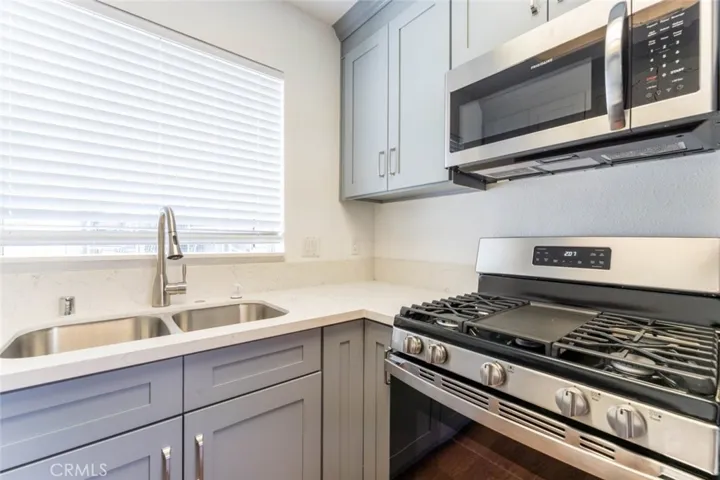 The lower level includes a private bedroom with full bath, perfect for a guest suite or dedicated office. The main level features an open living and dining area anchored by a cozy fireplace, a convenient powder room, and a balcony off the living room—great for morning coffee or evening downtime. The kitchen is beautiful, modern, and highly functional, complete with quartz countertops, stainless-steel appliances, and shaker cabinetry.