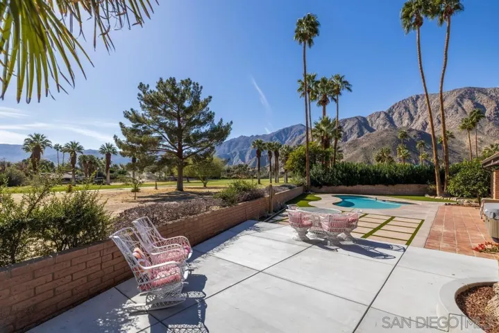 Prepare to be captivated by this exceptional, fully remodeled contemporary home overlooking the De Anza Golf Course, with sweeping mountain views that elevate everyday living. Thoughtfully redesigned from top to bottom, this residence feels straight out of a luxury design magazine, showcasing 3’x3’ porcelain tile throughout and a show-stopping, professionally designed kitchen featuring quartz countertops, beautiful custom cabinetry, and stainless steel appliancesExtensive upgrades include fully remodeled bathrooms, retextured walls with fresh interior paint, a tankless water heater, newer windows and sliders, a remodeled laundry room, and a newer HVAC system with iWave air purifier. The outdoor space is equally impressive, highlighted by a sparkling pool recently resurfaced, all-new hardscape and synthetic turf, a newer pool heater, pump, and filter, and beautifully updated landscaping with irrigation.Additional improvements include a newer roof, upgraded electrical and plumbing infrastructure, custom his-and-hers closets, a glass fireplace, an alarm system, and multiple gated yard areas offering privacy and flexibility. A large paver driveway provides ample parking for guests or an RV, complemented by a dedicated golf cart pad.This breathtaking, move-in-ready home delivers style, comfort, and resort-like living in one remarkable package.