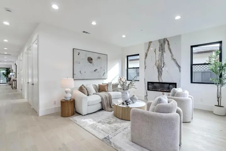 Brand-new single-story home with soaring 10ft coffered ceilings in the highly sought-after Monta Vista neighborhood, near Apples Infinite Loop & Spaceship Campus, major tech hubs, & Hwys 85 & 280. Top-rated schools include Lincoln Elem., Kennedy Middle, & Monta Vista High. A travertine-tiled covered porch & dramatic 6×8 double wrought iron front door create a striking entry. Inside features wide-plank engineered hardwood floors, recessed lighting, modern interior doors, tall Andersen double-pane windows, & hall closets. Open-concept living & dining areas showcase an electric fireplace with porcelain floor-to-ceiling slab mantel. The gourmet kitchen offers a waterfall island with Quartz Calacatta Casa countertops, matching slab backsplash, custom cabinetry, glass-front uppers, pendant lighting, walk-in pantry, & premium Thermador appliances including refrigerator & freezer columns, electric cooktop, wall oven, drawer microwave, & dual-zone wine cooler. The primary suite includes backyard access, walk-in closet, & spa-style bath with soaking tub, walk-in shower, floating double vanity, & water closet. Additional highlights include Sunrun 4.46kW solar with battery, Rachio irrigation, landscaped backyard with pavers & patio, epoxy-floored two-car garage, & smart-home automation.