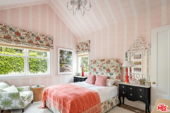 Designed by Gray Malin, renowned fine art photographer, this beautiful home exudes sophistication with a refined coastal elegance. Ideally located in Rustic Canyon, a prestigious enclave of the Pacific Palisades by the Pacific Ocean. The gated front courtyard features whimsical hedging, combining with mature trees and lush greenery for dramatic curb-appeal. Upon entry guests experience a double-height ceiling and voluminous rooms blending open-concept living with defined spaces. A formal entry, sitting room, office or den, and a refined dining room pivot around the stately oak spindle staircase. The living room with wood beamed ceiling, central fireplace and fully retractable wall of glass creates the optimal Southern California indoor-outdoor experience. The main level further includes a secondary dining area, top of the line chef’s kitchen featuring Sub-Zero and Wolf appliances with custom cabinetry and large island, dual dishwashers, a walk-in pantry, butler pantry with wine fridge, an office area, secondary entrance/mudroom and half bath. The second level is graced by an oversized primary suite with vaulted ceilings, fireplace, walk-out patio overlooking the lush backyard and canyon views, double walk-in closets, a beverage area and resort-like spa bath with heated stone flooring, soaking tub and steam shower. Three guest rooms, a flex-space perfect for a family room, children’s playroom, additional office or bedroom, three baths, and laundry complete the upper floor. At the lower level a generous family and entertainment room with state of the art movie screen, projector and surround sound, a secondary kitchenette/bar, a full home gym or bedroom and additional bathroom create the ultimate entertainment retreat. A beautiful mature oak tree defines the natural setting of the backyard with outdoor sitting areas with fire pit, a spa-pool with fountain, built-in bbq and alfresco dining area perfect for relaxation, play or entertaining guests. It offers the ultimate privacy with beautiful canyon views, a collage of greenery with citrus trees, hedges, a variety of flowers and raised garden boxes for harvesting farmed vegetables. The property features wide-plank floors and coastal designer details throughout with a 2-car garage, solar panels (with capacity to install Tesla Powerwall), EV charging, PuroServe home water filtration system and a storage room. With close proximity to nearby Rustic Canyon Park with tennis courts, top-rated Canyon & Palisades Charter Schools, and fine dining establishments Giorgio Baldi, Muse, the historic Golden Bull, Cafe Delfini, Rustic Coffee and Shore Bar. The home is matched for the most discerning clientele and can be purchased furnished, turn-key ready for occupancy. (Note: Photos 6,8,48 have been digitally altered to depict renderings of a larger pool and relocated firepit with lounge area. As per CA law, the original, unaltered image can be viewed next to the digitally altered image).