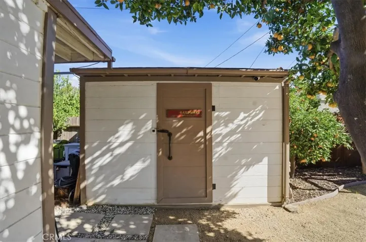 The living space extends into a comfortable family room and flows out to a covered wood deck featuring a built-in bar area overlooking the backyard filled with mature lemon, orange, lime, and grapefruit trees. For those seeking additional space, the finished two-car detached garage offers massive potential. Already modified with laminate flooring, a 3/4 bathroom, a private office or 3rd bedroom partition with dedicated wall AC, and an unfinished kitchenette area, this structure is primed for a full ADU conversion, a professional home studio, or guest quarters.
