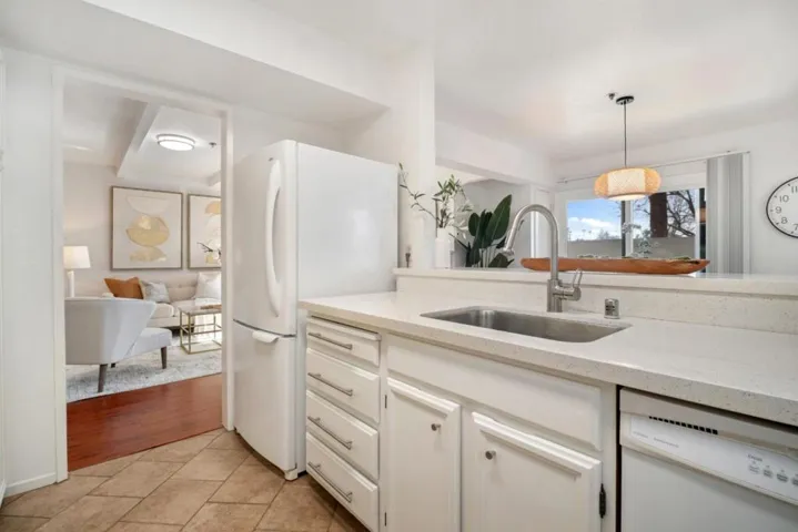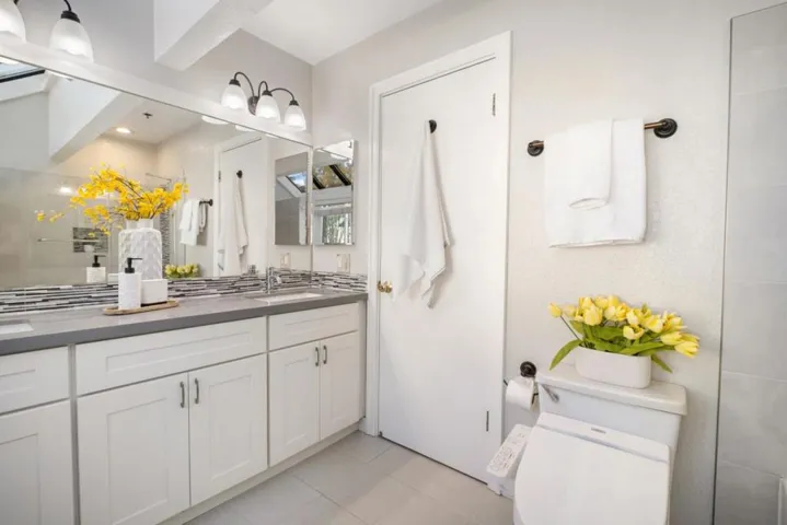 An updated townhome with vaulted ceilings, upgraded kitchen & baths, double-paned windows & a sun-filled enclosed room off the primary bed. Near top-rated Mountain View High, top tech campuses including Google, LinkedIn, Microsoft, Downtown Mountain View, Farmers Market, shopping, dining, parks. Inside, laminate flooring, fireplace & large sliding glass doors to a private patio. The kitchen features quartz countertop & stainless steel appliances: refrigerator, electric range, oven, built-in microwave, vent hood & dishwasher. Upstairs, bedrooms are spacious with high vaulted ceiling, the spacious primary bedroom features an sliding-door closet, windowed sitting area & an enclosed sun-filled space with floor-to-ceiling sliding glass panels and skylight. Bathrooms are upgraded & well appointed, with shaker-style vanities, designer tile finishes, tile flooring, frameless glass enclosures & modern lighting. One bathroom offers a spa-style shower panel system with rainfall showerhead, handheld wand, multiple body spray jets & built-in shower niche, while the other features skylights, a dual-sink vanity, wall-mounted showerhead, soaking tub, upgraded toilet with bidet seat & built-in open shelving. With easy access to Highways 82, 85, & 237, Caltrain & Light Rail stations.