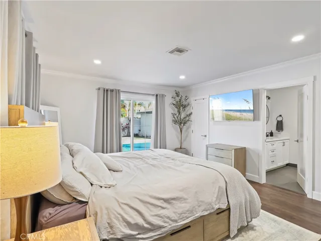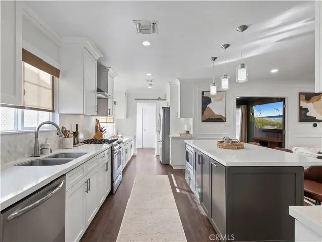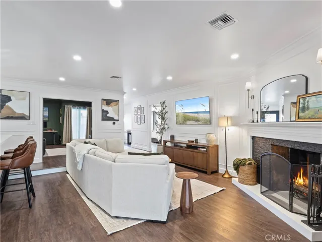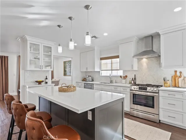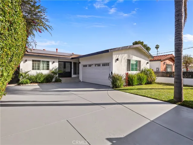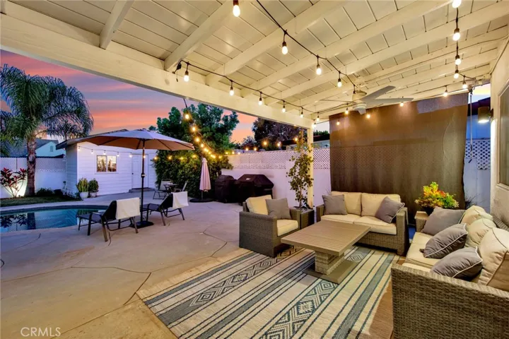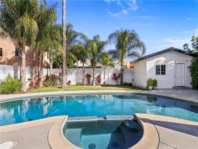 A California indoor–outdoor lifestyle defining residence set on a cul-de-sac, this gated and reimagined 4-bed, 3-bath, 1,944 sq ft home with a pool sits on a 7,252 sq ft lot, offering an open-concept floor plan, expansive living spaces, and total privacy. A gated entry, wide driveway, and attached two-car garage lead to a double-door entry opening to a foyer and a generously sized living room with fireplace, flowing into the kitchen and dining areas and extending outdoors through sliding glass doors to create a true great room experience. The fully remodeled kitchen serves as the centerpiece of the home, featuring white cabinetry and a contrasting large center island with breakfast bar that provides generous seating, prep space, and storage, including a built-in microwave. Quartz countertops, a full-height tile backsplash, pendant lighting, stainless-steel appliances, and abundant cabinetry with oversized lower drawers complete this modern kitchen. The dining area offers ample space for a full-size table for all occasions. The spacious primary suite offers a quiet retreat with sliding glass doors opening to the backyard, along with both a walk-in and second closet. The en-suite bathroom features a double-sink vanity with quartz countertops, custom cabinetry, and a tiled walk-in shower with glass enclosure. Three additional bedrooms are well-proportioned and beautifully finished, including a fourth bedroom ideal as a home office, media room, or flex space. The hallway bathroom includes a double-sink vanity with quartz countertops, blue cabinetry, and a tub/shower with glass enclosure and full-height tile. A third bathroom, ideal for guests and pool use, features a walk-in shower with convenient exterior access. A dedicated laundry room provides space for side-by-side machines. The private, resort-style backyard is ideal for entertaining or unwinding, featuring a sparkling pool and spa, palm trees, generous patio space, and a grassy area, perfect for soaking up the sun and enjoying true outdoor living. A large covered patio creates an inviting outdoor lounge for dining and relaxing, while a detached backyard studio measuring approximately 11’ x 12’ with power offers flexible use as a home office or hobby room. Schedule your private tour today.