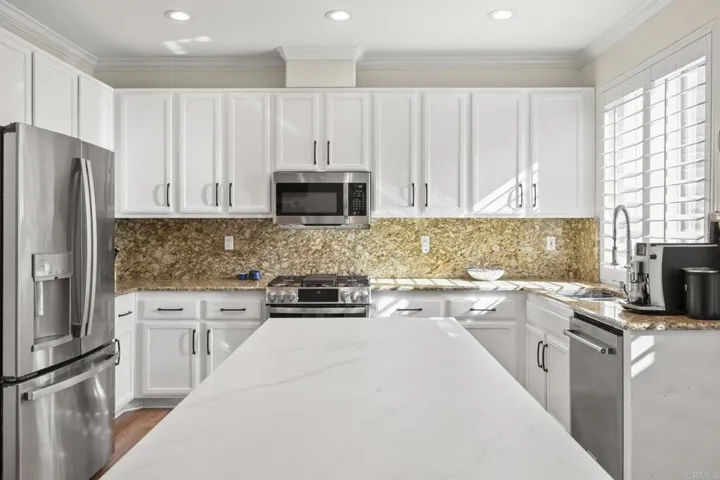 Make your dreams of homeownership come true with this polished “Palmilla” gem in Rancho Carrillo. Spectacular soaring ceilings greet you as you enter from the welcoming front porch. The floorplan features an open, airy living and dining area ideal for formal entertaining. A cozy tiled fireplace in the family room sets the mood for relaxed everyday living and opens seamlessly to the adjoining kitchen. The bright and sunny kitchen offers tons of workspace with granite countertops, a center island, refinished cabinetry, stainless steel appliances, and an abundance of recessed lighting. Upstairs, the spacious rear-facing primary suite serves as a private retreat with dual closets and a well-appointed, oversized bathroom. Two additional front-facing bedrooms share the upper level, along with a versatile loft that’s perfect for a home office, study area, or teen hangout. Step outside to the impressive rear patio where a metal pergola creates a covered outdoor living space surrounded by a semi-tropical setting—ideal for entertaining or unwinding at the end of the day. Additional features include central air conditioning, ceiling fans in all bedrooms and the loft, plantation shutters, vinyl plank flooring throughout the main level, and seller-owned rooftop solar that conveys with the home. Located in the highly sought-after Rancho Carrillo community, residents enjoy access to a resort-style swim center with pool and spa, clubhouse, scenic hiking trails, and RV parking (subject to availability). Conveniently close to parks, shopping, dining, and top coastal amenities, this home offers the perfect blend of comfort, style, and Carlsbad living.