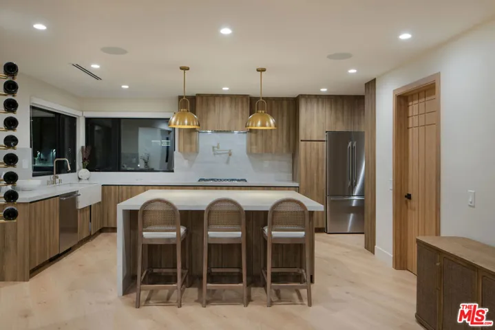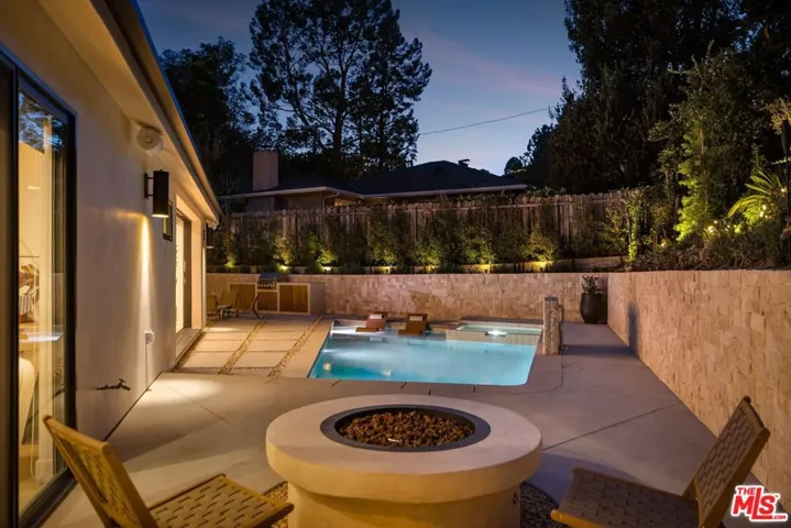 Nestled in the coveted hills of Sherman Oaks, this fully renovated contemporary home offers 4 bedrooms and 3.5 baths with the perfect blend of luxury, style, and functionality. Step through custom double entry doors into an elegant living space highlighted by a stunning travertine porcelain slab fireplace and soaring 11-foot ceilings – wide-plank engineered wood floors flow throughout, while each bathroom showcases a refined Roman clay finish. Expansive Fleetwood sliding doors open to a private resort-like backyard with pool, spa, custom ledger stone throughout, a Pentair system and a full outdoor kitchen including a built-in barbecue, sink, and refrigerator surrounded by mature ficus throughout, ideal for effortless entertaining. This smart home is fully integrated with advanced RTI and ADT systems, featuring upgraded switches, Episode speakers, security cameras, and a premium whole-house audio setup. Thoughtfully designed and move-in ready, this home caters to the most discerning buyers seeking a turnkey, fully furnished sanctuary in one of the Valley’s most desirable neighborhoods.