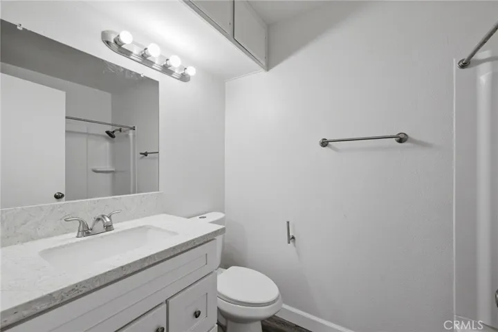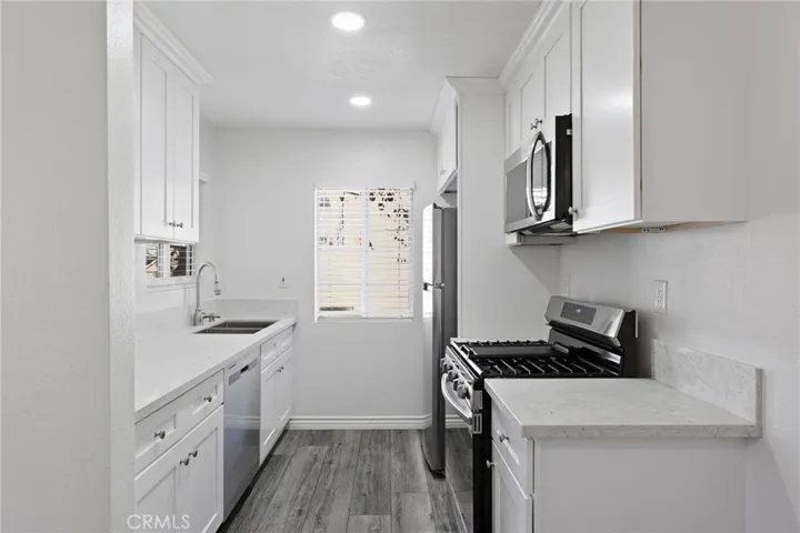 The upgraded kitchen is both stylish and functional, showcasing white shaker cabinetry, quartz countertops, recessed lighting, stainless steel appliances, a gas range, dishwasher, garbage disposal, and refrigerator. Enjoy the convenience of a full-size washer and dryer located inside the home, making daily living effortless. The remodeled bathroom features a newer white vanity, quartz countertop, and a bathtub/shower combination.
