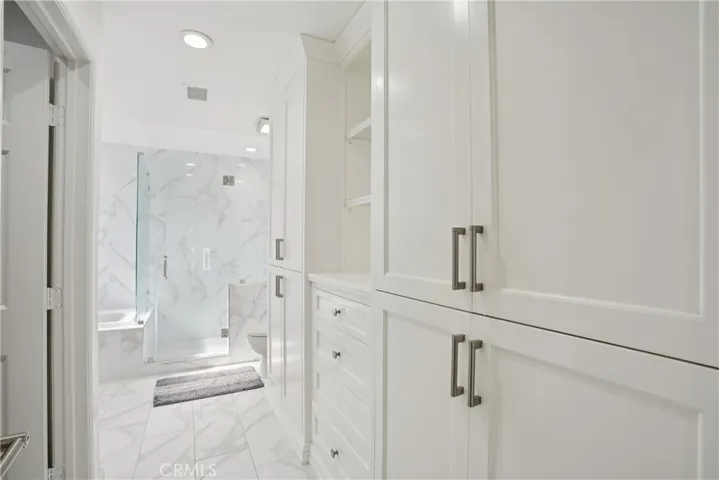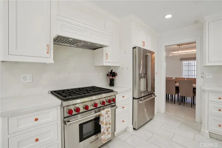 The upgraded kitchen is a chef’s delight, featuring stainless steel appliances, a gas cooktop, marble countertops, recessed lighting, wine refrigerator, and generous cabinetry. The kitchen opens effortlessly to the casual dining area and family room, creating an inviting and functional gathering space. A downstairs bedroom has been thoughtfully opened to expand the family room, enhancing the home’s open and airy feel.