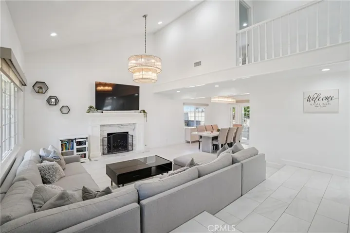 Beautifully appointed home nestled in the prestigious North Hills community, showcasing refined finishes and abundant natural light throughout. The open-concept living room is highlighted by tile flooring, soaring vaulted ceilings, recessed lighting, a gas fireplace, and a dramatic picture window that floods the space with sunlight. The living area flows seamlessly into the dining room, which offers serene views of the lush backyard—perfect for both everyday living and elegant entertaining.