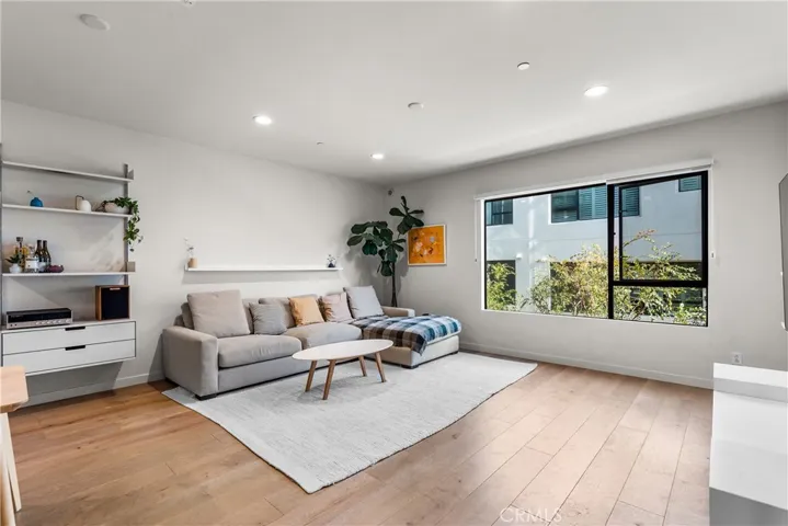 The main living level is open and light-filled, with 9-foot ceilings, wide plank neutral wood flooring, and oversized windows creating an effortless connection between the living, dining, and kitchen areas. The kitchen is beautifully appointed with quartz countertops, a generous eat-in island, custom cabinetry, open shelving, and premium stainless steel Bosch appliances, perfect for entertaining or intimate evenings at home.