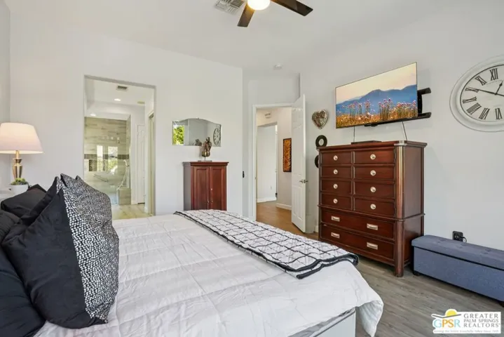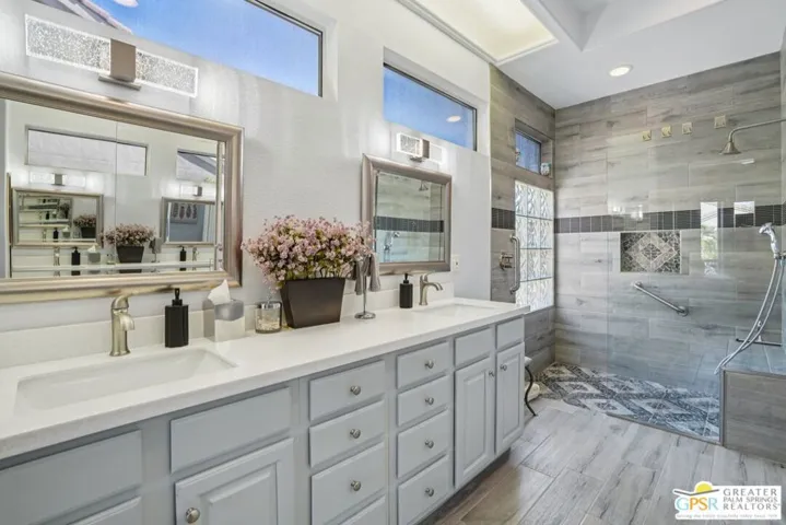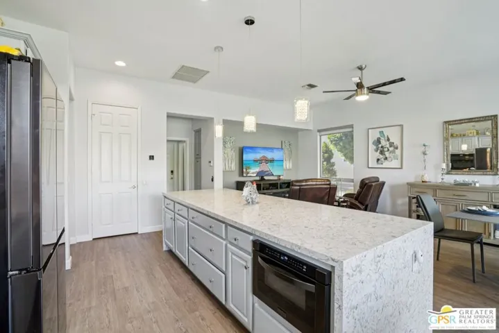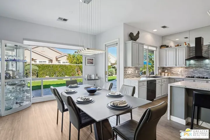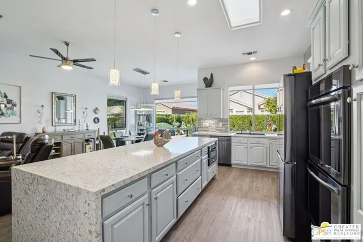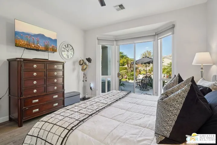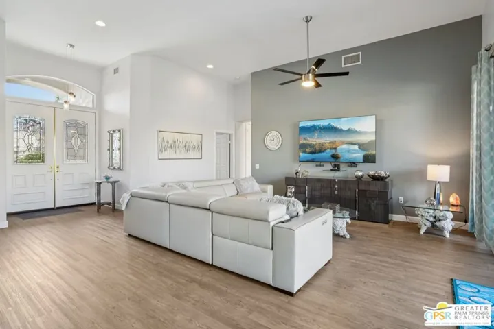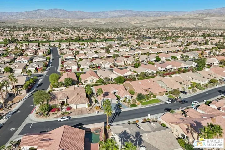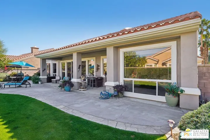 Set on a quiet street near the Sunset View Clubhouse, this upgraded 3 bedroom, 3 bath extended Monaco with extended garage offers over 2,500 sq ft of versatile desert living inside Del Webb Sun City Palm Desert, one of the country’s most sought after 55+ communities. The light filled great room opens to a private backyard with lawn, spa, and waterfall, creating a true indoor-outdoor retreat. The open kitchen and family room feature a large center island and casual dining area ideal for entertaining or everyday comfort. The primary suite includes a very spacious walk-in closet, large bathroom closet with plenty of storage, and beautiful spa-style shower. Two additional suites, each with their own private access, offer exceptional flexibility for guests, a home office, or income-producing casitas. Additional highlights include a laundry room, oversized two car garage, plus a dedicated golf cart garage. Residents enjoy access to two championship golf courses, resort-style pools, a modern fitness center, walking trails, clubhouses, dining, and endless social activities, all within a beautifully maintained, guard gated community. This is relaxed, resort-style desert living at its finest. Furnishings available outside of escrow