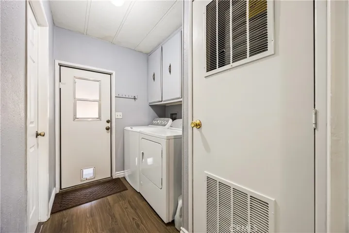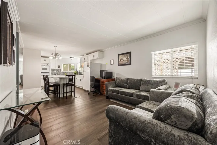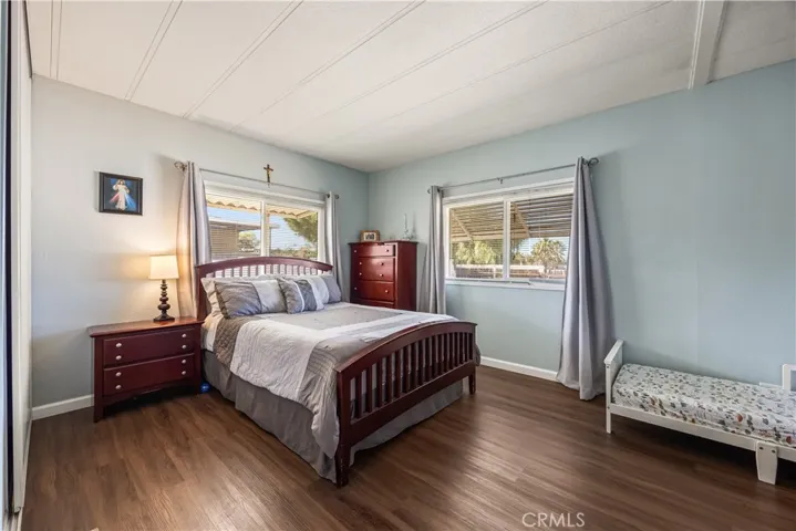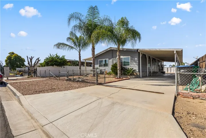 Beautifully remodeled 3 bedroom, 2 bath manufactured home located in the charming small town of Nuevo. This inviting home offers a bright open-concept kitchen and family room, complemented by a separate living room and formal dining area with built-in cabinetry. The fully remodeled kitchen features granite countertops, gorgeous glass tile backsplash extending to the cabinetry, farmhouse sink, white appliances, and premium finishes throughout. The spacious primary suite includes a private bath with relaxing garden tub and separate shower. Two additional well-sized bedrooms provide flexibility for guests, family, or home office use. Enjoy easy-care front and back yards, mature palm trees, covered front patio with privacy lattice, and ample covered parking. Two storage sheds offer additional convenience. Major upgrades completed in 2020 include vinyl windows, remodeled kitchen and bathrooms, premium vinyl flooring, new ducting for HVAC system , and updated interior gas piping. Additional recent improvements include a new roof (approximately six months old) and leased solar system for energy efficiency.