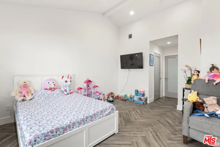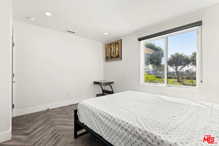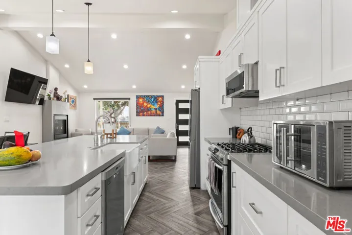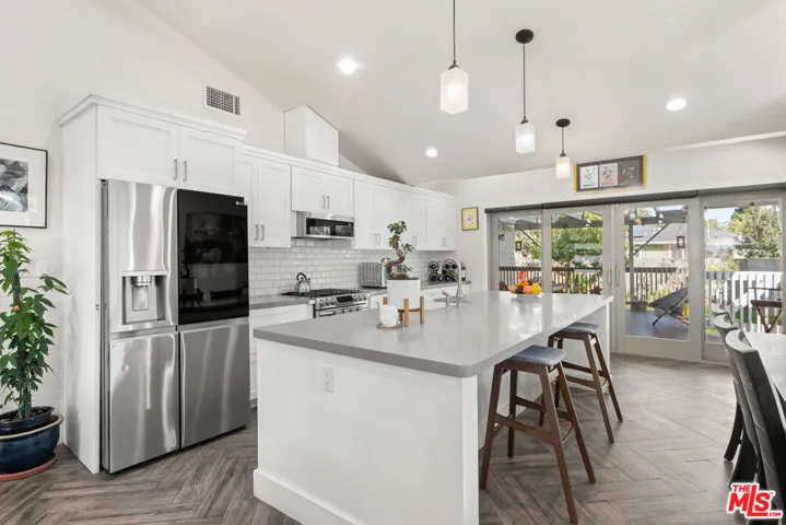 A feel good ranch style home in the Marlow Burns tract of Westchester, simply and wonderfully expanded and renovated in 2019, offers exceptional curb appeal and an open floor plan on a greenbelt street. A charming porch entrance with a custom front door greets you as you step inside and are welcomed by vaulted ceilings and a perfect amount of natural light infusing the open floor plan. The kitchen boasts a large center island with seating, quartz countertops, subway tile backsplash, stainless steel appliances, and soft-close shaker cabinets, with a large pantry, and a fireplace anchoring the living area. Step out onto the large covered deck for dining and lounging. The en suite primary bedroom features vaulted ceilings, a walk-in closet, and large sliding doors that open up to the rear deck. The left wing of the home features three bedrooms, one en suite and two with generous sizing, including a large second bedroom with a walk-in closet that will make you think you’ve walked into the primary bedroom. The home features well appointed finishes throughout, including 7′ doors and sliders, fiberglass double pane windows, copper plumbing, a tankless water heater, and recessed lighting with dimmers. Additional features include central AC and heat, and a finished attached garage with laminate flooring, storage cabinets, serving as a versatile space perfect for a playroom, workshop, meditation, or training area. The hallway to the garage is flanked by a coat closet and laundry closet with side by side appliances and additional shelving. The backyard also features bonuses in the form of a storage shed, fruit trees and extra room for an herb garden.