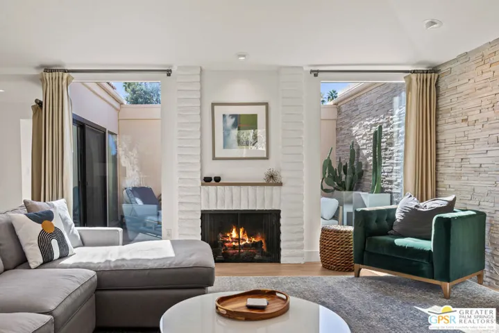 Welcome to a beautifully designed home in an exceptional community. From the moment you enter, there’s an immediate sense of calm and ease that comes from thoughtful design and cohesive, high-end material choices. Tile floors run throughout the home, connecting seamlessly with floor-to-ceiling glass and extending out to the patio overlooking the quiet, expansive grounds of Sunrise East. Natural stone accent walls flow from interior to exterior, adding warmth and a timeless yet modern character. Symmetrical south-facing windows frame the white oak mantle and gas fireplace, filling the space with natural light and balance. The kitchen is designed with both function and quality in mind, featuring quartz countertops, frameless shaker cabinetry, and smart pull-out wood drawers, everything in its place. A matching wet bar in the living room makes entertaining effortless. The primary suite is a true retreat, offering blackout shades, white shutters, and a spa-inspired ensuite with wall-to-wall tile, an oversized shower, and a skylight that opens to let in fresh air. Sunrise East now offers four new pickleball courts and two tennis courts, and there’s even more to discover in person, including the two-car garage. And yes, this is FEE land.