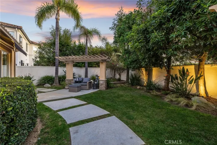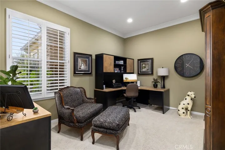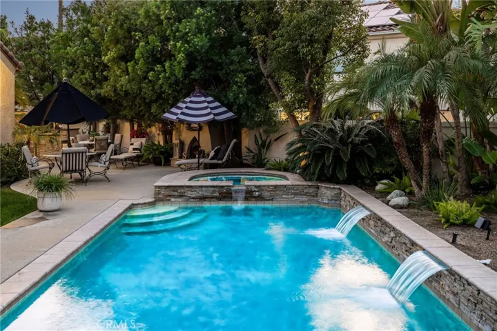 A refined single-story residence offering timeless architecture, privacy, and resort-style outdoor living, introduced by a striking stone-arched entry. Set within the gated La Verne Heights community, the home is approached by a brick-lined walkway and manicured landscaping, creating a warm and architectural first impression. Inside, the entry opens seamlessly into the main living spaces, where abundant natural light, plantation shutters, and crown molding establish an inviting, refined tone. The living room overlooks the front yard with mountain views through a bay window and flows effortlessly into the adjacent dining area. Just off the entry, a private office or optional fourth bedroom with double doors offers flexible use. The kitchen opens directly to the family room, forming a natural gathering space and featuring rich wood cabinetry, a spanning island with bar seating, Thermador stainless steel appliances, and a pantry. An open breakfast nook with sliding glass doors extends the living space outdoors, reinforcing the home’s effortless indoor–outdoor connection. The family room is anchored by a stone fireplace with custom built-in cabinetry and media center, complemented by crown molding, plantation shutters, built-in surround speakers, and abundant natural light through a wall of shuttered windows. The primary suite is a serene, retreat-like space designed for comfort and privacy. Generously sized, it features plush carpeting, crown molding, a ceiling fan, and shuttered windows that fill the room with soft natural light. A cozy fireplace adds warmth and character, while sliding glass doors open directly to the backyard, offering a peaceful connection to the landscaped grounds. The primary bath is spacious and thoughtfully designed, featuring dual vanities with generous counter space, a dedicated vanity area, a privacy door to the water closet, and modern light fixtures that create a bright, spa-inspired feel. A soaking tub sits beneath a window with plantation shutters, complemented by a separate glass-enclosed shower with full tile surround. Designed as a series of outdoor living spaces, the backyard features a private side-yard pool and spa with cascading water features, mature tropical landscaping, a grass area, and mountain views. The rear entertaining yard is complete with pergola-covered patios, a stacked-stone built-in barbecue with granite counters, Viking appliances including dual burners, and a custom outdoor fireplace.