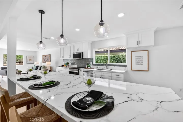 Pleased to introduce a beautifully renovated home, wholly redesigned throughout with a contemporary style, situated on a picturesque, tree-lined street in Fullerton, adjacent to a cul-de-sac within a highly sought-after neighborhood. Upon entering through the front door, you are welcomed by a bright and open interior layout that harmoniously connects each living space, creating a warm and comfortable setting for joyful family evenings. The master bedroom offers the convenience of a walk-in closet and features a wall-like glass sliding door that opens directly to the backyard, allowing you to enjoy the fresh morning air. The en-suite master bathroom is designed in a sleek, contemporary style, with a shower booth, tile flooring, and vanity that blend together seamlessly. The chef’s kitchen is designed for both beauty and functionality—complete with custom cabinetry, quartz countertops, premium stainless steel appliances-perfect for entertaining and everyday living, and a large island which stages the room’s design by adding style and functionality to the most popular spot in the house. The spacious backyard is ideal for relaxing, gardening, and entertaining. Additional highlights include an attached 2 car garage, long driveway for extra parking. Just minutes from Amerige Heights Town Center, offering shopping, dining, and recreation.