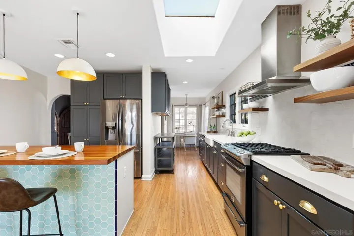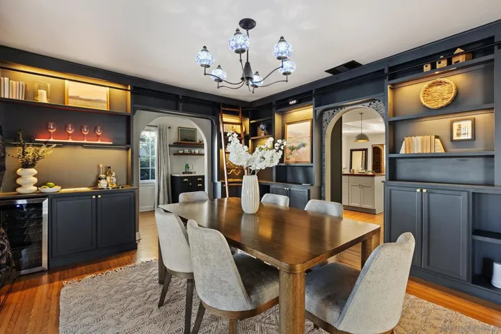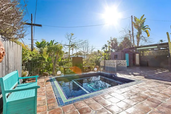 Discover your new retreat in San Diego’s beloved Kensington neighborhood. This charming Spanish ranch offers 2 bedrooms, 2 baths, and a large private lot that also includes an approved ADU conversion permit for the garage, presenting a rare opportunity for added living space or rental potential. Upon entry to this gem, a formal living room with a cozy fireplace and original Batchelder tile greets you, leading to your formal dining area. The renovated kitchen features designer cabinets with a wine fridge, as well as a bar, overlooking a comfortable family room. Relax on the charming, covered porch of a backyard that is the undeniable star of the home, offering a resort-style oasis with a heated pool and spa, a dry sauna, outdoor shower and lush landscaping. Steps descend to a private detached structure, perfectly suited for yoga, meditation, or a creative retreat. You’ll also enjoy a garden featuring lime, avocado, lemon, nectarine, and tangerine trees. Historical elements include original windows and stucco, with some restored. Modern conveniences include a SimpliSafe system, and app-controlled pool and lighting. This stunning property is perfect for those seeking comfort and style in Kensington.