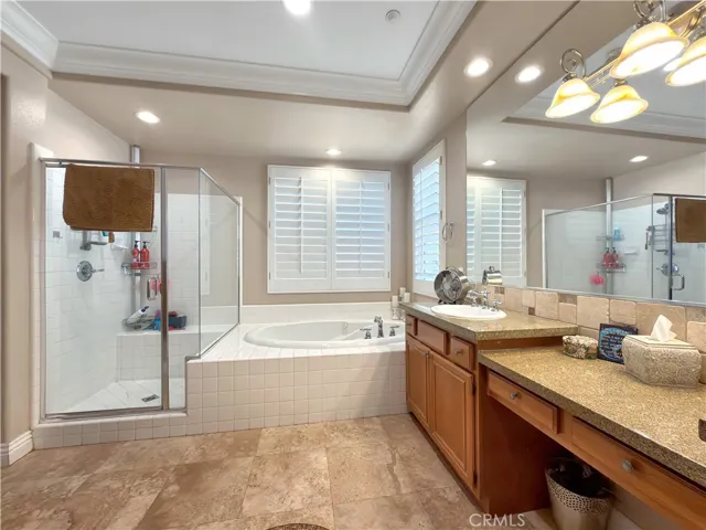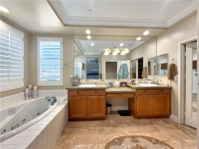 Additional highlights include hardwood floors, travertine, and designer carpet throughout, plantation shutters, crown molding, upgraded baseboards, newer air-conditioning system, intercom/radio system, newer water heater, closet organizers, and a three-car attached garage with epoxy flooring, built-ins, and overhead storage.