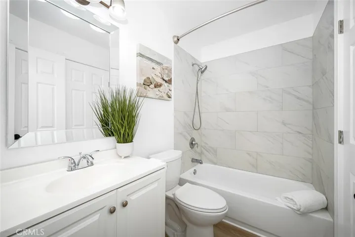 EXCEPTIONAL PARK-LIKE LOCATION TUCKED AWAY IN THE HEART OF CYPRESS VILLAGE, WITH EXTENSIVE REMODELING THROUGHOUT! THIS GORGEOUS END UNIT, WITH DUAL OWNER’S SUITES, HAS BEEN TRANSFORMED WITH STUNNING UPGRADES & STYLISH TRENDY FINISHES. This ultimate sanctuary blends timeless elegance with modern luxury, beginning with the spacious living room boasting brand new wood-look vinyl flooring, a gas fireplace, recessed lighting, and a truly serene greenbelt view. Enjoy open-concept living where the dining space flows into the newly designed kitchen, featuring gorgeous Koville custom-built soft-close cabinetry, impeccable quartz counters, glossy subway-tile backsplash, a new microwave & dishwasher, a large pantry cabinet, and recessed lighting. Thoroughly immersed in natural lighting and perfect for entertaining friends & family. You will appreciate the generously sized owner’s suite, with brand-new plush carpet, dual mirrored closets, a slider to your private patio, and an upgraded ensuite bath with a shaker-style vanity, quartz countertop, on-trend sink & faucet, and a walk-in shower. The 2nd owner’s suite features double-door entry, new plush carpet, an entire wall of substantial new mirrored wardrobe space, delightful greenbelt views, and an immaculate full ensuite upgraded bath with beautiful tile surround. Additional upgrades & amenities include dual pane windows & sliders, smooth ceilings, new interior paint, new panel doors & door casing, new modern black hardware, new high baseboards, new vanity mirrors & medicine cabinets, new toilets, a Carrier Furnace & A/C, an interior laundry closet, and substantial storage space. The backyard patio offers an inviting retreat! Here, enjoy an easy & low-maintenance outdoor living space, with an aesthetically appealing stucco wall, and convenient access to a fully finished 2-car garage with an upgraded garage door & upgraded lighting. Adjacent guest parking is a phenomenal bonus!! Award-winning local schools are Patton Elementary, Bell Intermediate, & Pacifica High School, and all are highly rated 9’s & 10’s. Enjoy proximity to shopping, dining, LA Fitness, nearby local parks, Costco, Trader Joe’s, & easy access to local Fwys! Wonderful Cypress Village has 3 Pools, 3 Clubhouses, a Huge Spa, a Kiddy Pool, Tennis, Pickle Ball, Lush Greenbelts & Meandering Pathways, & a low HOA of $399! Enjoy resort-style living in this premier community with the world-famous beaches of Orange County just a few miles away. Welcome Home!