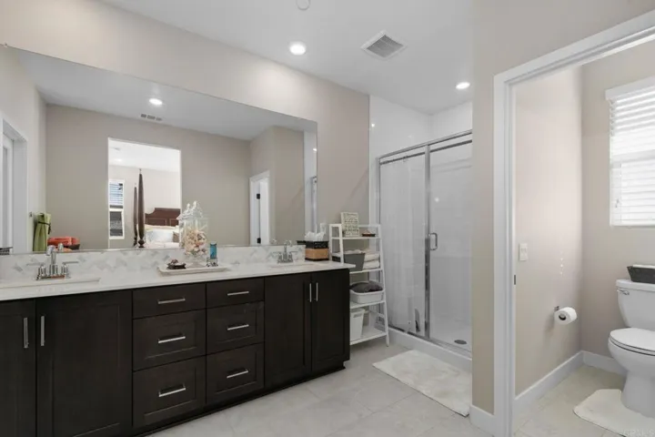 Beautiful two-story townhouse with magnificent panoramic views!!! Home is a corner unit and full of natural light. There is no unit to the Southwest of this property. Just beautiful open space and VIEWS! This home is gently lived in and is still brand new!! Excellent floor plan with powder room down. Kitchen appliance series are all GE and they all convey with the sale. The back splash was selected by the seller and continue all the way up to the upper cabinets. The kitchen cabinet drawers are all self-closing. Floors are by SK Laminate Flooring – Caribbean Collection and are continuous throughout the home and are high quality vinyl in a timeless color of medium light wood finish. There is no carpeting in the home. Window treatments are all the same wide panel blinds and are throughout the home. Seller owns the solar outright. Seller installed the patio pavers through an independent landscape company, and pavers cover the entire patio. Very low maintenance. The master bedroom in a very comfortable size and faces SW and so much natural lighting. The stairwell has a landing and is NOT a straight up climb to the second floor. This is very accommodating for all ages. Master suite offers a large walk-in closet and bathroom has double vanities. In addition to the two guest bedrooms there is a loft which could easily be an open office, kids game room and or tv room, with unlimited uses. The garage is large for 2 car parking and comes with an electric car charger. The complex has a large, inground heated handicap access pool and spa. The cabana includes a BBQ area, showers, bathrooms and a tot lot to expel childish energy. This home is in a securely gated community close to shopping, San Marcos State and Palomar Hospital. This is a quiet community and very well maintained. This development is not jammed packed with multiple developer units. There is good space with wider streets and walk ways. There was great thought put into this serine complex. This townhouse is gently lived in and cared for. It is better than purchasing a new unit from the developer!! Solar is included.