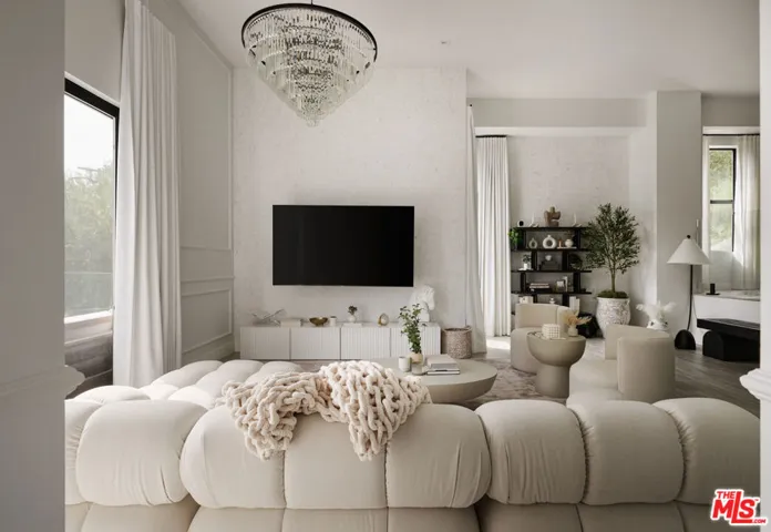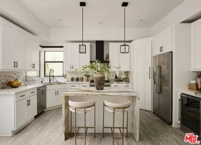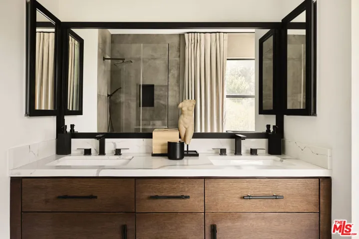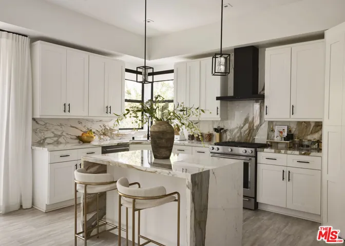 Nestled in the tranquil hills of Woodland Hills, this 2019-built modern residence exemplifies the seamless fusion of luxury and contemporary design. Located south of Ventura Boulevard, this exceptional property offers both refined elegance and intimate comfort, making it a true architectural gem. Upon entering, the home immediately captivates with its soaring ceilings and expansive, open-concept layout, flooded with natural light. Custom drapery frames the windows, adding a sophisticated touch to the space. Recessed lighting accentuates the airy atmosphere, creating a perfect balance between modernity and warmth. In a masterful play of light and texture, custom wallpaper imported from Italy delicately finished with 24k gold leaf adds a whisper of luxury and an artist’s touch to the walls. The chef’s kitchen, features a striking center island, a unique Mediterraneo Macchia Antica porcelain backsplash and countertops. Premium stainless-steel appliances, making it an ideal space for culinary enthusiasts. The adjacent family room, anchored by a cozy fireplace, invites both intimate gatherings and entertaining. Upstairs, the primary suite provides a luxurious retreat. The redesigned bath offers a spa-like sanctuary, complete with dual sinks, a freestanding tub, and a separate walk-in shower. A spacious walk-in closet ensures ample storage, while the private balcony presents sweeping views of the serene surroundings. The home includes two additional generously sized bedrooms, each thoughtfully designed for comfort and style. The lower level has a dedicated office/bonus room which offers flexibility for work or leisure, catering to a variety of lifestyles. The residence is equipped with the latest in-home technology, including a NEST thermostat, Sonos surround sound throughout the entire home, dual-zone air conditioning, and a tankless water heater. Unbreakable glass has been installed for added security and peace of mind. The garage has been transformed into a state-of-the-art gym, complete with high-end equipment, custom flooring, and a sauna. Ideal space for both fitness enthusiasts and relaxation. Custom finishes throughout the home include lime-wash accents, adding a unique and timeless character to the property. Situated just moments from Ventura Boulevard and Westfield Topanga, residents are within easy reach of dining, shopping, and entertainment options, including movie theaters and chic boutiques. This Woodland Hills sanctuary is a rare find, offering a harmonious blend of thoughtful design, modern amenities, and unparalleled craftsmanship.
