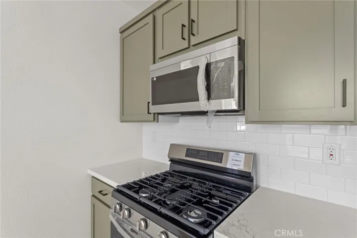 The spacious living area seamlessly connects to the kitchen, creating an ideal layout for daily living and entertaining. The kitchen boasts stylish Clover shaker cabinetry, quartz-style countertops, stainless-steel Whirlpool appliances, and ample cabinet and prep space.