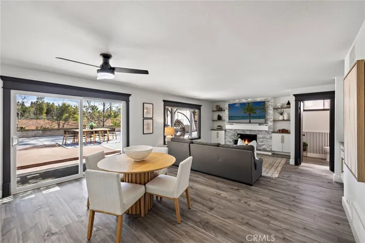From the moment you arrive, this exceptional four bedroom, three bath residence captivates with a presence that simply feels like the one! The dramatic entry showcases a striking architectural staircase accented by custom wood slats with concealed storage, updated flooring and a statement chandelier that draws the eye upward. The open-concept living and dining areas, designed to maximize natural light, flow effortlessly from the foyer and are highlighted by a beautifully refreshed fireplace with custom built-in cabinetry and shelving, complemented by updated flooring—ideal for both everyday living and refined entertaining.