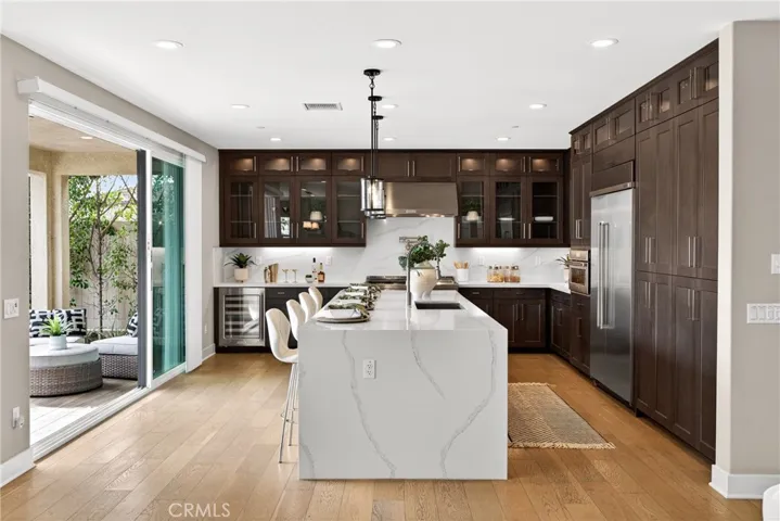 Professional-grade range and double ovens enable simultaneous cooking. Built-in wine fridge. Quartz spans the oversized island and perimeter countertops. Floor-to-ceiling soft-close cabinetry. Multi-panel window sliders retract completely, merging the great room with the covered patio. Thoughtfully landscaped backyard. Main-level guest suite with full bath provides privacy from upstairs sleeping quarters.