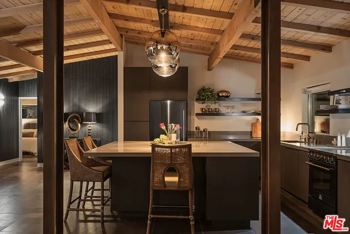 A secluded desert retreat where architecture, landscape and light move in quiet harmony. Set behind a private gate, this extensively remodeled mid-century residence offers a rare balance of refined design, intentional layout and effortless indoor-outdoor living, framed by open skies and mountain silhouettes. At the heart of the home is an expansive great room where the kitchen, living and dining areas unfold as one continuous, light-filled space. Clean modern lines, exposed original wood beam ceilings and curated textures create a sense of grounded luxury, while expansive glass sliders stretch along the perimeter, dissolving the boundary between inside and out. The kitchen anchors the space both visually and functionally, featuring sleek custom cabinetry, integrated appliances, open shelving and a dramatic central island designed for gathering, cooking and conversation. The primary suite occupies its own private wing, offering a serene retreat with generous proportions, direct outdoor access and a spa-like bath complete with dual vanities and a glass-enclosed shower. A spacious walk-through closet and private patio enhance the sense of retreat and separation from the rest of the home. On the opposite side, three additional bedrooms with private patios and two spa-like baths are thoughtfully arranged, creating a comfortable guest or family wing. Outside, the property truly comes alive with a resort-style pool surrounded by sculptural desert landscaping and multiple lounging zones designed for slow mornings and golden-hour evenings. The seamless connection between the interior and outdoor spaces allows the home to live as beautifully outside as it does within. Located just 10 minutes from Palm Springs, this stunning property was created for those who value intentional living, privacy and timeless desert style – a place where modern design meets the restorative rhythm of the desert.