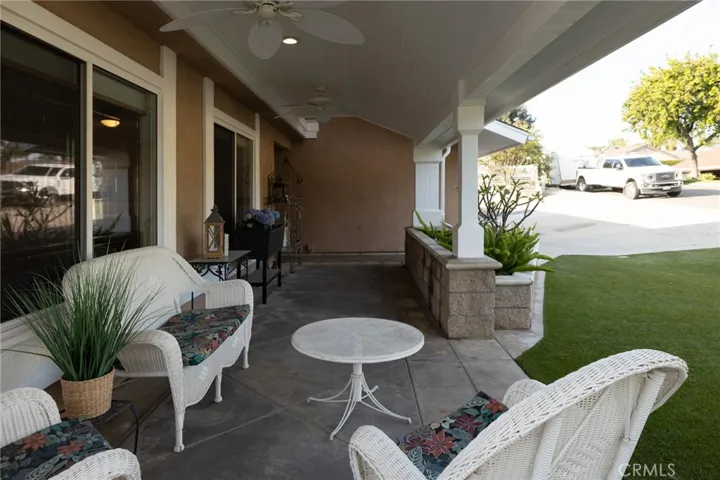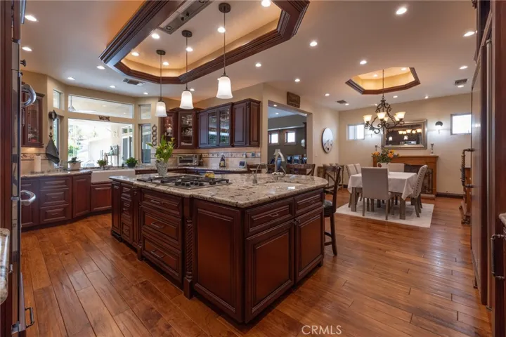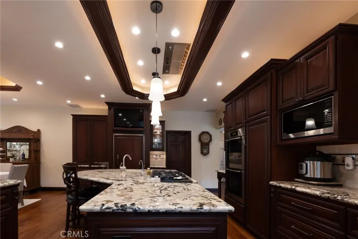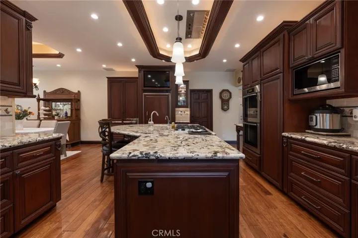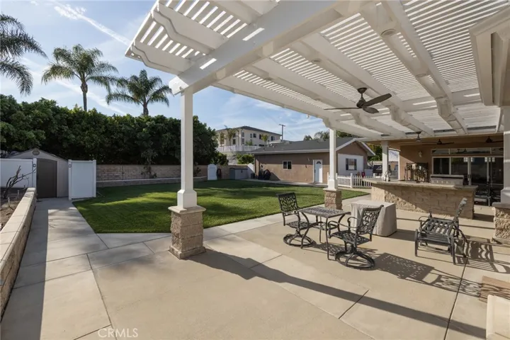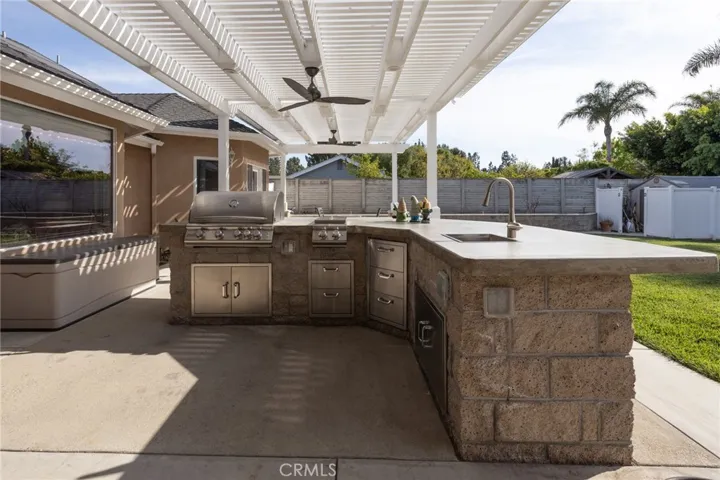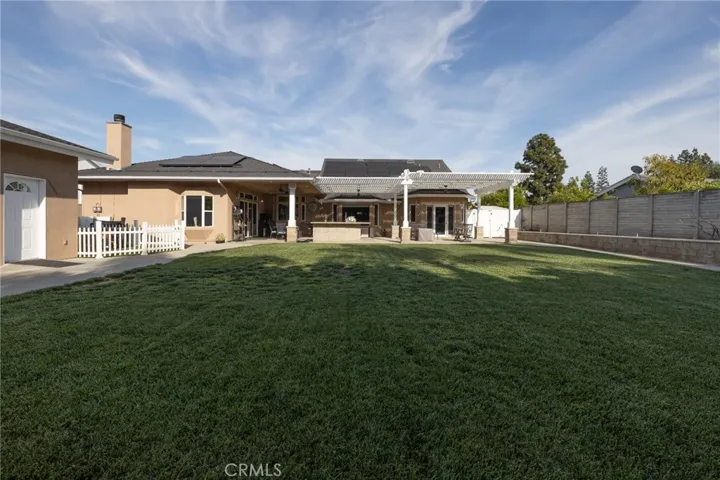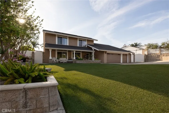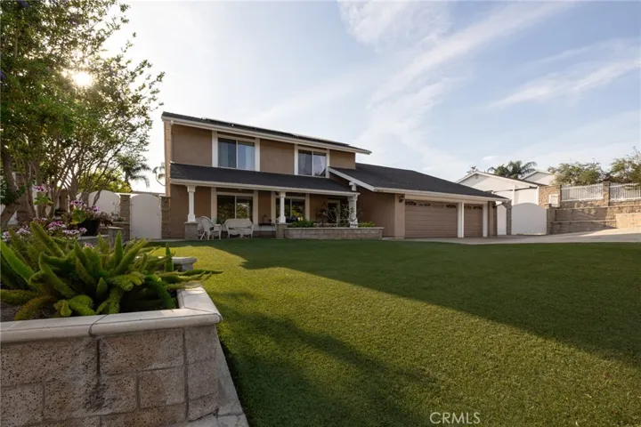 Multigenerational living in Yorba Linda! The main house lives like a single level with the primary ensuite & two bedrooms/one bath on the first floor and two beds/one bath upstairs. The detached ADU offers potential for income, and the RV driveway offers separate access as well as electricity and a dump station. This 5 bed, 3 bath home with a 2 bed 1 bath ADU and RV parking on an oversized lot with solar panels offers room for the whole family. For those warm Summer nights, the extended roof patio spans the front of the home in rain or shine, and your front lawn will always look mowed with the manicured artificial turf. The RV gate is 17 ft wide and the driveway is over 60ft long and 18ft wide from eves to wall along side the 3 car garage. Inside, views to the backyard, vaulted ceilings, and a warm wood floor greet you. The classic kitchen is beautifully appointed with top-of-the-line appliances including a Sub Zero refrigerator, Dacor 5 burner stove, Miele double ovens and warming drawer, Kitchenaide stainless dishwasher and fridge with panel doors matching the cherry cabinets with beading. A Farmhouse sink and solid maple pullout drawers including a spice rack, and two lazy Susans with many soft close drawers make this kitchen as functional as it is beautiful. The spacious island showcases Splendor granite, a vegetable sink and seating for three. The ample cabinetry also offers a coffee cabinet and Splendor backsplash diamond cut outs. An abundance of lighting tops it off. The dining area accommodates a 12 ft table and warm fireplace. Come hang out in the very spacious and warm great room with stone covered fireplace and raised hearth. Windows and glass doors to bring in lots of light and a built in desk with cabinets span one whole wall. Step out to the patio where you’ll find an outdoor kitchen with concrete counters, a Blaze BBQ, 2 burner stove, sink and garbage disposal. Green grass, avocado trees, and the ADU are surrounded by Slump Stone and Concrete walls. The 920 foot ADU hosts 2 bedrooms and 1 bath with kitchen overlooking a very spacious gathering area, lots of cabinetry and its own laundry and an outside gated artificial turf yard. Step back into the primary bedroom doors from the patio in the main house to find a spacious primary bedroom with a wall of closets, walk in shower in the primary bath and 2 more first level bedrooms and the hall bath hosts the tub. Upstairs -two large bedrooms and a full bath. Shopping, theatre and great schools!
