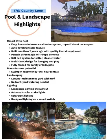 Extensively upgraded home with resort style, custom pool & 8-person spa with lighting, PebbleTec, saltwater system, Wi-Fi controls, decorative slide & waterfall. Solar pool and spa heating for year-round enjoyment. Outdoor kitchen and full outdoor bathroom, integrated gas fireplace and grill, huge play structure & two pergolas. Large lot! Stunning inside with vaulted, exposed beam ceilings, open floor plan, gorgeous kitchen with large center island. Primary suite upgraded with expansive closet system from Tailored Closet. Modern conveniences include Level-2 EV charging, mew Samsung Bespoke appliances, smart switches & smart garage. Thoughtful upgrades: new custom stamped-concrete driveway, luxury vinyl plank flooring, brand-new tankless water heater, whole-house filtration, beautiful landscape & lighting, and a 6-ton central AC (installed 2017). See documents for the complete improvements list. 2017 down-to-the-studs renovation with ongoing, owner-added upgrades since. No HOA. Solar lease.