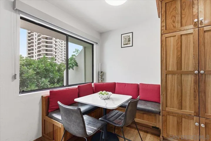 Experience elevated townhome living in the heart of Downtown’s prestigious Marina District within the coveted Park Row community. This exceptional second-story residence welcomes you with rich hardwood floors, soaring ceilings, and an airy open-concept design that blends sophistication with warmth. The expansive living room is illuminated by oversized windows and skylights, while a striking walnut-trimmed fireplace with art tile detailing creates an elegant focal point. A versatile dining area flows seamlessly into the timeless kitchen, thoughtfully appointed with custom black walnut cabinetry, quartz countertops, gas cooking, and refined finishes throughout. Oversized sliding glass doors extend the living space outdoors to a private balcony, where city views stretch toward Seaport Village and the Bay, an ideal setting for effortless indoor-outdoor entertaining. A custom-designed staircase leads to a bright, architectural loft featuring a built-in executive office for two (or bedroom), complete with solid wood desks, extensive bookcases, and integrated storage. A second set of sliding doors opens to an exclusive rooftop deck—perfect for sunset views and starlit evenings above the city. The private primary suite offers a tranquil retreat with a generous jetted soaking tub and a recently remodeled spa-inspired shower. Additional highlights include central air conditioning, in-unit laundry, recessed lighting, and abundant storage. Park Row residents enjoy lush park-like grounds adorned with sparkling fountains, a resort-style pool and spa, secured underground parking, 24-hour gated security, and ample guest parking, all just moments from waterfront dining, Seaport Village, The Rady Shell, Petco Park, the Gaslamp Quarter, the Convention Center, Balboa Park, and San Diego International Airport. A rare opportunity to enjoy refined townhome living in one of Downtown’s most distinguished locations.