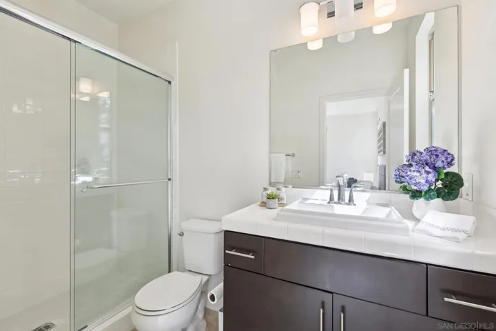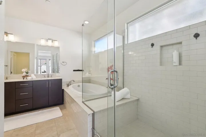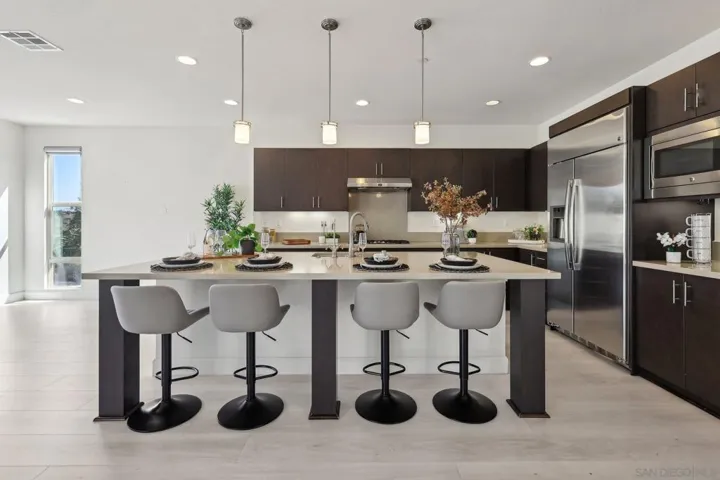 Stylish contemporary home in a desirable gated community with stunning valley views. Built in 2015, this 4-bedroom, 3.5-bath residence offers 2,576 sq. ft. of bright, open living space with soaring ceilings and a functional open-concept layout. The first floor features a private primary suite plus an additional en-suite bedroom, ideal for guests or multi-generational living. Upstairs includes two additional bedrooms offering comfort and privacy. The chef’s kitchen showcases a built-in refrigerator, granite countertops, and premium cabinetry, perfect for everyday living and entertaining. Enjoy seamless indoor-outdoor living in the spacious backyard with breathtaking views. Fully paid-off solar system adds energy efficiency and long-term value. Conveniently located near shopping, dining, freeways, and major tech hubs including Qualcomm, Google, and UCSD.