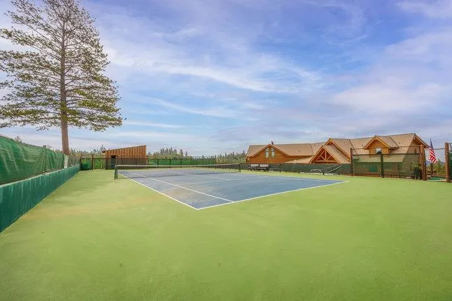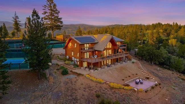 Extraordinary opportunity awaits buyers seeking a private estate, luxury vacation rental, duplex, or boutique inn conversion. This architectural masterpiece offers over 8,000 sq. ft. of breathtaking log construction on 5 scenic hilltop acres in Murphys, ideally situated between Lake Tahoe and Yosemite. Originally designed and built as an award-winning Bed & Breakfast by renowned Bay Area tennis professionals, this meticulously maintained property blends rustic elegance with modern infrastructure. The estate features: guest suites with ensuite baths, professional-grade commercial kitchen, dramatic 23-foot Great Room with a 10′ stone fireplace & wet bar, Loft/Library, game room, Office/Den, oversized laundry room, massage room, private apartment w/separate entrance and second kitchen. Outdoor highlights include: Two regulation-size tennis courts, Dual EV chargers, Tesla Powerwalls, Generac backup generator, Two central A/C units plus eight mini-splits, Quadruple water filtration system, on-site well servicing gardens and filtered water supply, drought-tolerant professional landscaping. Enjoy sweeping 360° panoramic views from this commanding hilltop setting. A rare opportunity to own the real estate not the business and reimagine this exceptional property to suit your vision.
