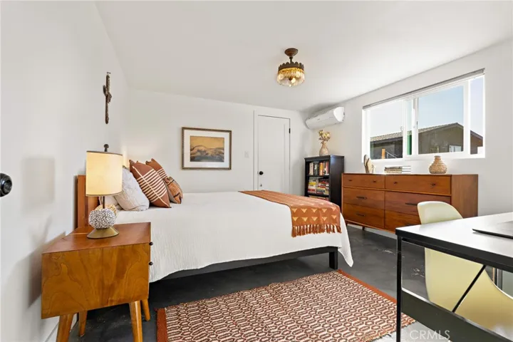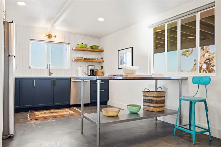 The 2-bedroom, 1-bath home features an open-concept layout with seamless flow between the living, dining, and kitchen areas. Polished concrete floors run throughout, creating a clean, modern desert aesthetic. The dining space is anchored by a statement Malm fireplace, adding warmth and architectural character. The kitchen includes a Bertazzoni induction range, blending high-end performance with modern design. Mini-split systems throughout the home provide efficient heating and cooling year-round and stacked washer and dryer.