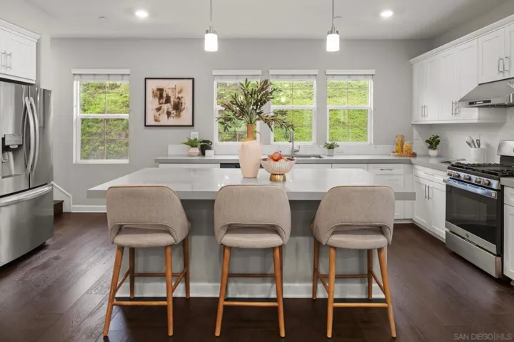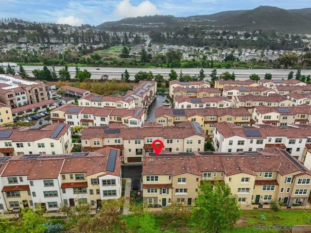 Beautiful 2021-Built End Unit Townhome in the Sought-After Promenade at Pacific Village – No Mello Roos! Welcome to this stunning three-level corner home where modern design meets effortless everyday living. Bathed in natural light from extra windows, this end unit townhome has 200 sq ft more living space than interior units. Featuring 9-foot ceilings and an open-concept living space, the heart of the home is perfect for gathering, relaxing, and entertaining. The modern kitchen boasts quartz countertops, a large island, pantry closet, and generous counter space — blending functionality with style. Step outside to enjoy your morning coffee on the charming front patio or unwind on your balcony on the second level, both ideal for fresh air and our Southern California sunshine. Smart and sustainable living are built right in, with a Solar Power Purchase Agreement (PPA) to help keep energy costs low and a whole-home water softener system for enhanced comfort and efficiency. Thoughtful details include a bedroom and full bathroom on the entry level, ideal for guests or a home office, and a dedicated laundry room for added convenience. Upstairs on the third level, the primary suite offers a peaceful retreat with a walk-in closet and a beautifully finished bathroom. The Promenade at Pacific Village offers resort-style amenities — a sparkling pool, playground, BBQ and picnic areas, and several dog parks. With no Mello Roos, easy access to fwys, shopping, dining, and top-rated Poway Unified schools, this home delivers! Come and see for yourself!