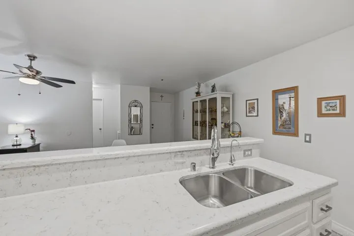 Beautifully updated 2-bedroom, 2-bath residence in the gated community of La Costa Hills offering a bright, open layout and quality finishes throughout. Rich hardwood flooring runs through the main living areas and bedrooms, creating warmth and continuity, while the remodeled kitchen features quartz countertops, white cabinetry, stainless steel appliances, bar seating, and a spacious walk-in pantry that flows seamlessly into the dining and living spaces. Both bathrooms have been tastefully renovated with modern finishes, complementing the home’s clean, cohesive design. The desirable dual-suite layout provides privacy and flexibility, and sliding doors open to a private patio surrounded by mature greenery, an inviting setting for relaxing or entertaining. Additional highlights include upgraded dual-pane windows and sliding door, in-unit laundry, a dedicated interior storage room, and a covered parking space conveniently located just out front. Residents enjoy resort-style amenities including a pool, spa, sauna, fitness center, recreation room, and beautifully maintained grounds, all just minutes from parks, shopping, dining, beaches, and top-rated schools, offering an ideal blend of comfort, privacy, and North County lifestyle.