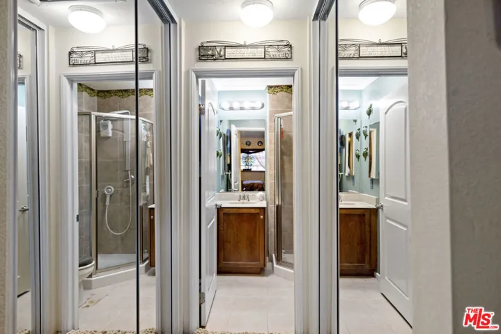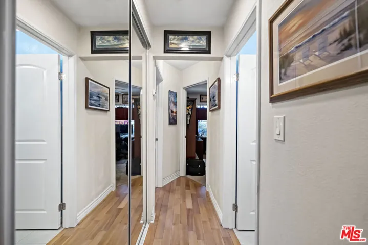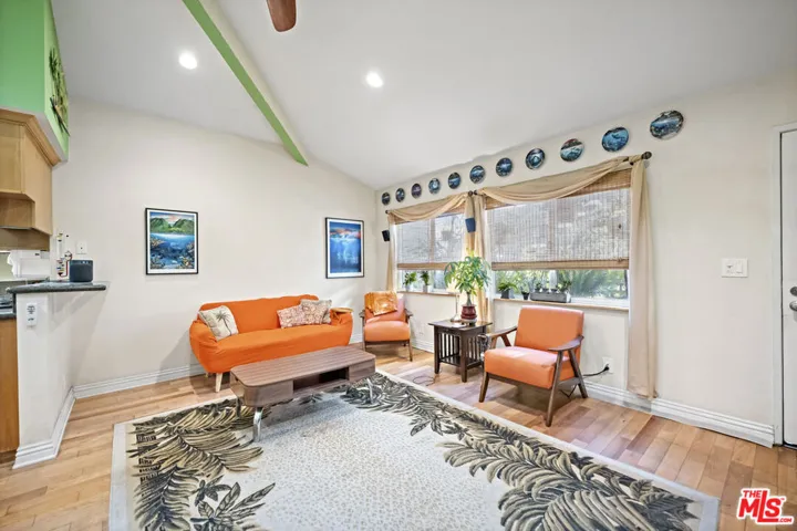 The Villas is a small complex convenient to the freeway and beaches. This secured building features controlled access, gated entry, and a parking garage with dedicated spaces. This property presents a great opportunity for buyers or investors, featuring a floor plan that boasts vaulted ceilings, abundant natural light, and light-toned hardwood floors. The interior is designed for comfort and efficiency, featuring a security door, double-paned windows, central air/heating, and a whole-house fan. The living room is equipped with hardwired internet, a multi-speed ceiling fan, and a skylight. Newer window coverings with wooden sills add a refined touch, while the high-quality surfaces and bathroom tile have been professionally sealed. The kitchen and laundry area includes a gently used LG Direct Drive washer/dryer and custom shelving. The primary suite offers vaulted ceilings, a swivel TV, and a misting shower head. Both bedrooms feature mirrored closets with organizational racks, with additional storage in the attic and linen closet. Originally built in 1984 and converted in 2006, this home includes dedicated office space and matching finishes kept in storage. This end unit is ready for immediate move-in and includes a south-facing front door and private patio.