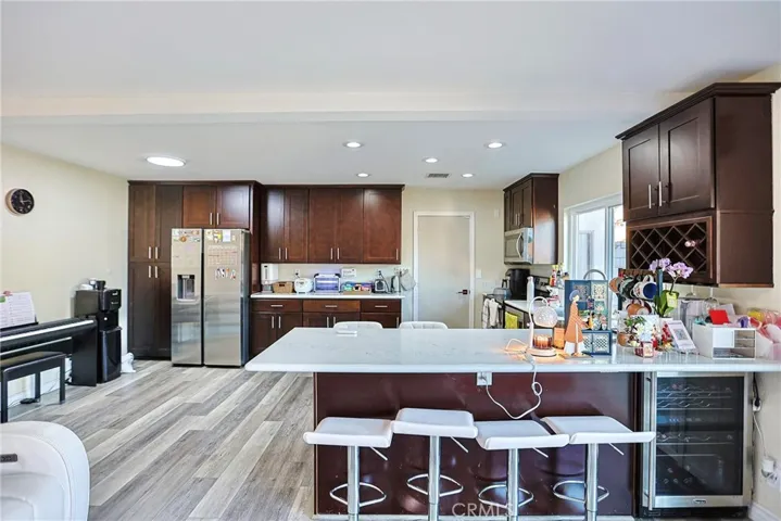 The bright, open living and dining area flows into an upgraded kitchen with quartz countertops, ample cabinetry, stainless steel appliances, wine fridge, and built-in wine rack. Upstairs features three additional bedrooms and an updated full bathroom.