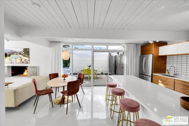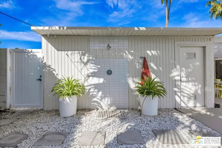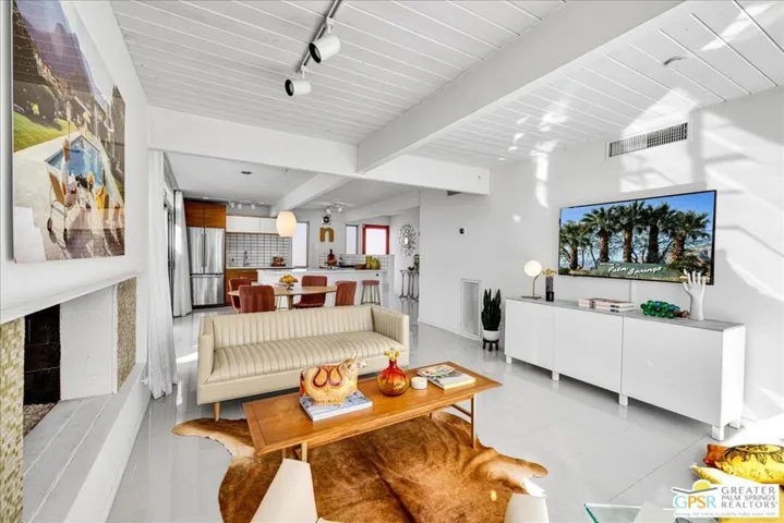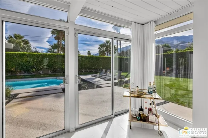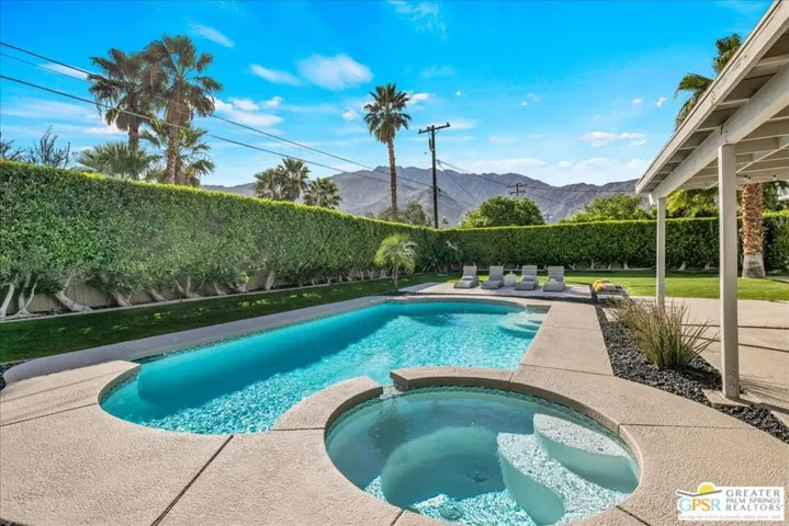 A “Palmer & Krisel” Original. Nestled in the historic and iconic Racquet Club Estates, this Mid-Century stunner designed by Palmer & Krisel and built by Alexander Construction Co. perfectly captures the innovative spirit of desert modernism. This neighborhood is a true reminder of the importance of design, famous for its five distinct rooflines and architectural pedigree highlighted by open floor plans, atriums, and breezeways. Inside, the signature post-and-beam construction is flooded with California sunshine via breathtaking walls of glass and strategically placed clerestory windows that frame the incredible San Jacinto mountain views. While retaining its 1959 soul, this residence has been meticulously updated for the 21st century to blend vintage charm with modern luxury. The unique, restored floating iron and tile fireplace serves as a stunning focal point for cool desert nights, complemented by glossy tile floors. The kitchen features Caesarstone counters, custom cabinetry, and sleek stainless steel appliances. Even the bathrooms have been thoughtfully coordinated with modern mosaic accent tiles that feel authentically Palm Springs. Practical updates like OWNED solar, an EV charger in the garage, updated plumbing, and dual-pane windows ensure this classic home functions with contemporary efficiency. Designed for the quintessential indoor-outdoor living experience, the spacious south-facing backyard is a private resort and the ultimate Palm Springs lifestyle. A gorgeous swimming pool invites you to float for hours, while a jetted spa helps you de-stress under the starry desert nights. The outdoor space is an entertainer’s dream, featuring a custom sunshade canopy and a covered patio defined by a vibrant artist-curated mural. Whether you’re sipping cocktails by the mural wall or rinsing off in the tiled outdoor shower, every inch is framed by beautiful landscaping and striking views. Located just blocks from the chic downtown area and all things cool Palm Springs has to offer. This home is a magnet for architecture fans seeking a sophisticated second home or a full-time residence. Welcome to Racquet Club Estates, stop dreaming and start living the life you’ve always imagined.