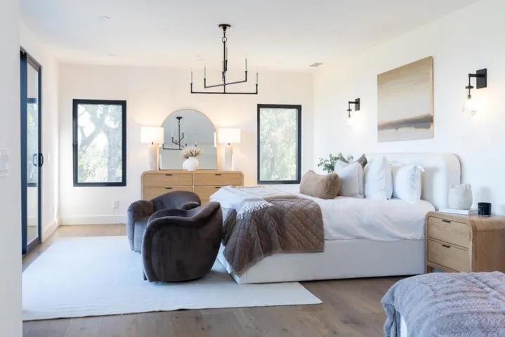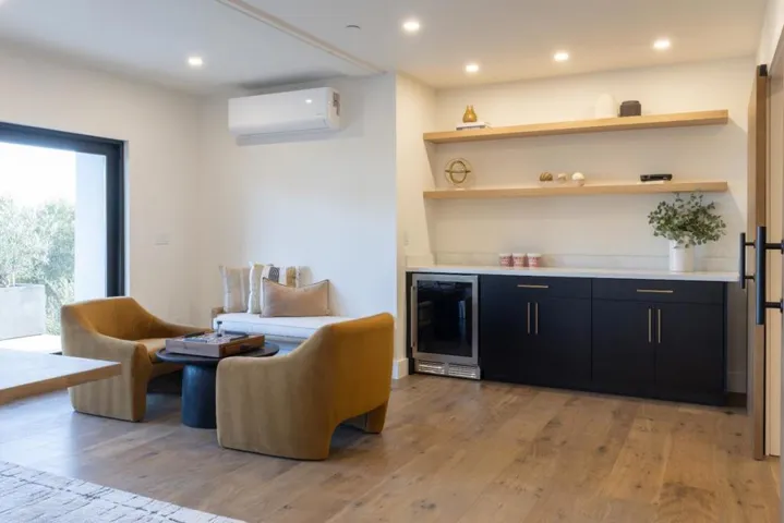 A rare opportunity to own an earthy modern estate set in the esteemed Woodside Hills with breathtaking sweeping Bay views. The residence was rebuilt with uncompromising attention to detail, offering a truly like-new experience that has never been lived in. Situated on 0.98 acres, the 6,809 sq ft home blends dramatic scale with warm, livable sophistication for true California Living. The thoughtfully designed floor plan includes 4 well-appointed bedrooms, 4 designer bathrooms, 1 powder room, dedicated office, flex studio, media room, laundry/mud room, and luxurious rec room. The designer kitchen serves as both a functional showpiece and an entertainers dream, featuring open steel & beam vaulted ceiling, natural light, custom white oak cabinetry, top-of-the-line appliances, wet bar, pantry, temperature controlled wine cellar, and designer finishes. The grounds include a stunning chefs kitchen, fire pit lounge, abundance of areas to entertain, view decks, and a refreshing pool. Surrounded by other distinguished estates, 150 Brookwood Rd is an iconic offering, combining design-forward architecture, extraordinary views, exceptional outdoor living, and an unparalleled Woodside setting to create a one-of-a-kind luxury retreat. Buyer to verify.