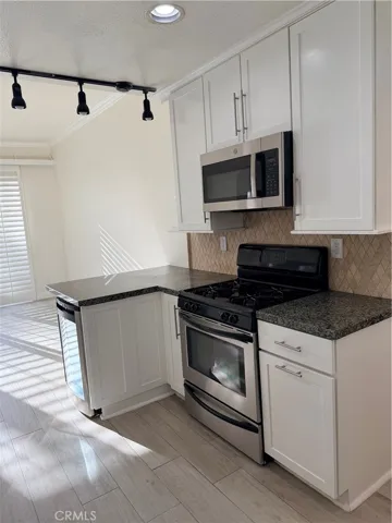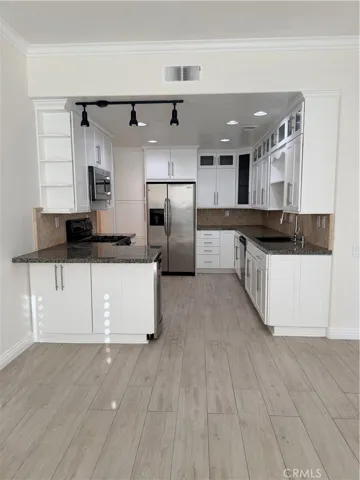 Freshly painted and remodeled end-unit townhome in turnkey condition. Property is approximately 1,636 sq. ft. with 3 bedrooms upstairs and 2.5 bathrooms and 2 car attached garage. The gourmet kitchen offers white cabinetry with built-in organizers, wine fridge, granite counters with tile backsplash, deep dual-tub sink, and stainless appliances. Spacious family room adjacent to the kitchen makes a great gathering area. Light and bright living room and dining area. Beautiful luxury vinyl floors throughout the home, designer stain glass privacy window, plantation shutters, gas burning fireplace, and 2 skylights. Large master bedroom with walk-in closet with built-in clothes organizers, remodeled bath with dual-sink vanity and balcony. Oversized wrap-around front patio with turf and custom hardscape. Interior pool side location and close to schools, restaurants, shopping, and 73 toll way.