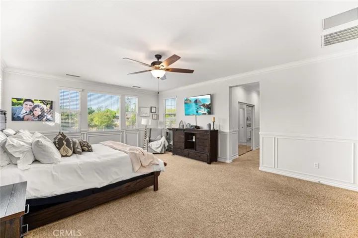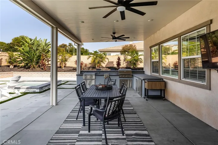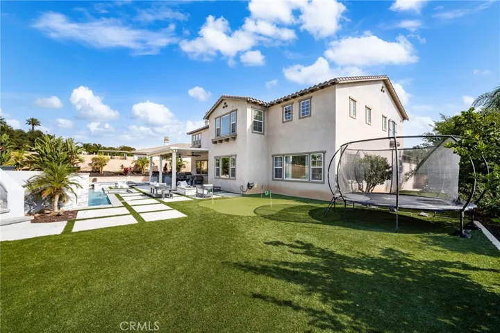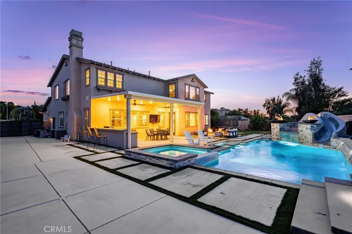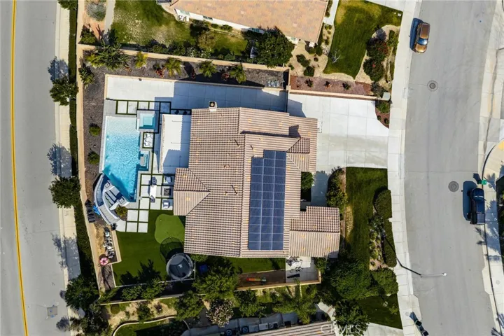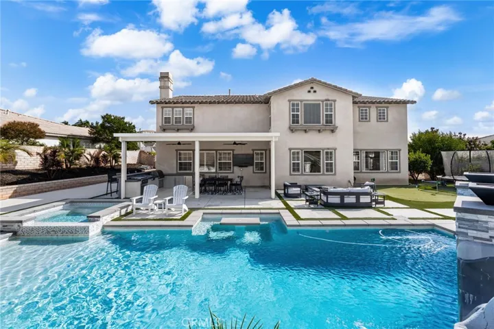 Largest Model in Sierra Heights this Luxury Pool Home with a 4-Car Garage plus Solar. Welcome to this stunning 5 bedroom, 4.5 bathroom home located in the highly desirable Sierra Heights community. Built in 2010 by Standard Pacific Builders, this spacious residence features ebony-finished hardwood floors, soaring cathedral ceilings, and an open-concept layout perfect for entertaining.The gourmet kitchen is equipped with stainless steel appliances, a 5-burner stove, double oven, built-in microwave, dishwasher, and extensive cabinetry throughout. Downstairs includes a large office/den/playroom and a private bedroom with full bath ideal for guests or in-laws. Upstairs, the primary suite offers dual walk-in closets, jacuzzi tub, walk-in shower, dual vanities, and elegant wall moldings. Additional features include a loft (easily converted to a 6th bedroom), 3 more bedrooms, 2 full baths, and an oversized laundry room with utility sink. Enjoy indoor/outdoor living with a fully upgraded backyard featuring a newer pool with waterslide, spa, built-in BBQ, Teppanyaki grill, refrigerator, firepit, covered patio, backyard speakers, and a putting green.Bonus features: 220V in garages, Solar, RV access/parking, 4-car tandem garage, surround sound wiring, low taxes, and convenient access to the 91 Freeway, Tyler Mall, restaurants, Kaiser Hospital, and Metrolink