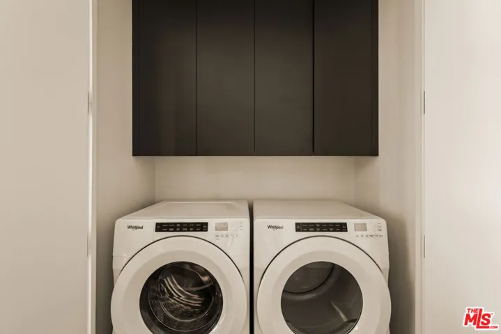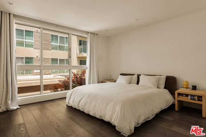 The residence unfolds with warm, thoughtful design and clean architecture, layered with texture and modern details. The open-plan layout is anchored by a striking kitchen that balances function and design: custom flat-front cabinetry in rich wood and charcoal tones pairs beautifully with sleek black stone countertops. Professional-grade Wolf appliances, a stainless steel vent hood, and an integrated Sub-Zero refrigerator elevate the kitchen into a true culinary workspace, while a waterfall island with an oversized sink invites both cooking and gathering. Adjacent to the kitchen, a dedicated dining area comfortably accommodates a full dining table, making it ideal for entertaining. Beyond the kitchen, the living area is framed by expansive windows that bring in soft daylight, along with a generous seating area. The flow between kitchen, dining, and living spaces feels seamless yet intentional, making the home equally suited for hosting or quiet retreat. Sliding glass doors and large panes of glass visually extend the living space outward, in addition to a large balcony. The bedroom is serene and spacious, offering room for a king-size bed and additional furnishings without compromising openness. Floor-to-ceiling windows continue the theme of light and calm, while custom window treatments provide privacy. The ensuite bathroom features a long stone vanity with ample storage and a walk-in glass shower. Finishes are clean, modern, and timeless. Completing the residence is a discreet laundry closet with full-size Whirlpool washer and dryer and custom upper cabinetry. It’s a space designed for contemporary living, where beauty and functionality exist in equal measure, offering a refined yet effortless place to call home.