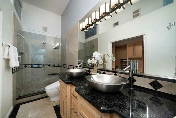 Outside, the private backyard enjoys southern exposure and is designed for relaxation and entertaining, with flagstone hardscape, a built-in gazebo, gas fireplace, artificial turf, mature trees, and a fountain with three cascading waterfalls. An outdoor shower completes this serene escape.