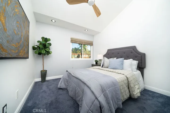 Additional upgrades include double-pane tinted windows, whole-house water filtration, complete re-plumbing, upgraded electrical, a tankless water heater, modern shades, and a Nest thermostat. Two secondary bedrooms provide flexibility, including one with custom office built-ins. The two-car garage offers storage cabinetry and soundproofed adjoining walls. An energy-efficient Asko washer and dryer are included.