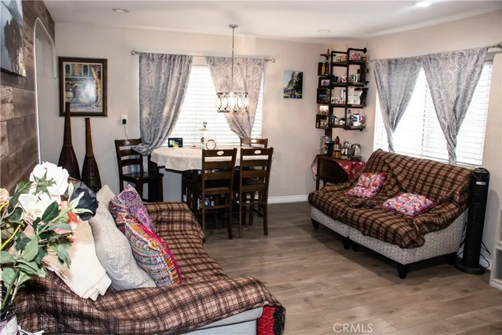 The open floor plan is enhanced with new recessed lighting and stylish rustic-modern laminate flooring throughout the living room, hallways, and bedrooms.